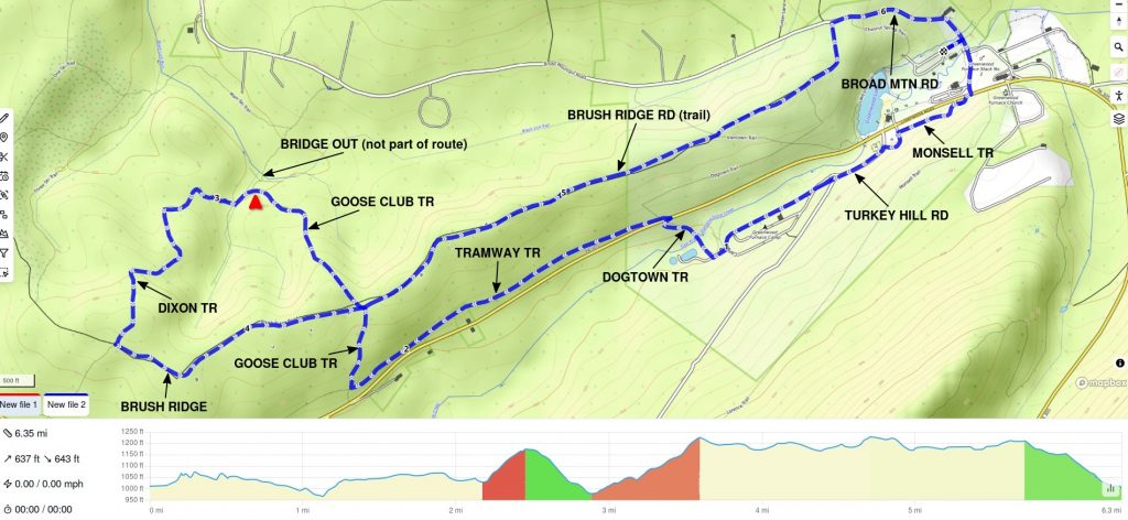 This stretch of Tramway is a little more challenging than most of the trails, a bit rougher with some rocks, roots, brush. The loop on Goose Club and Dixon and the return on Brush Ridge are easy. Broad Mountain road is paved, but has little traffic.