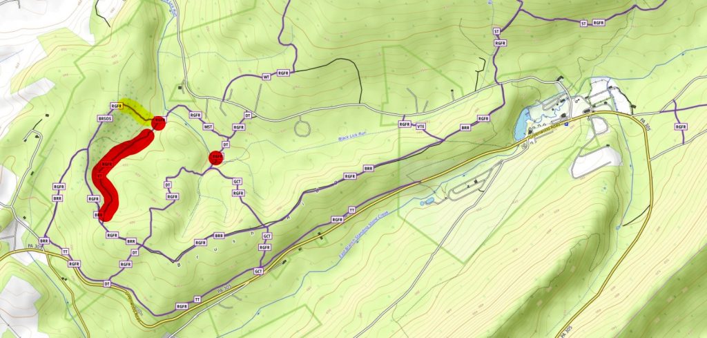 A pleasant six mile loop along Brush Ridge, with a loop down to Black Lick Run. Starting from Blacksmith Shop parking, take Broad Mountain road to Brush Ridge trail. Loop on Goose Club and Dixon trails. The last two trails have significant grades but they aren’t ridiculous. Footing is generally quite good, as the north slope of the ridge is shale. One modest stream ford. Some small trees down, all passable. Branches cut back. [verified May 2025]